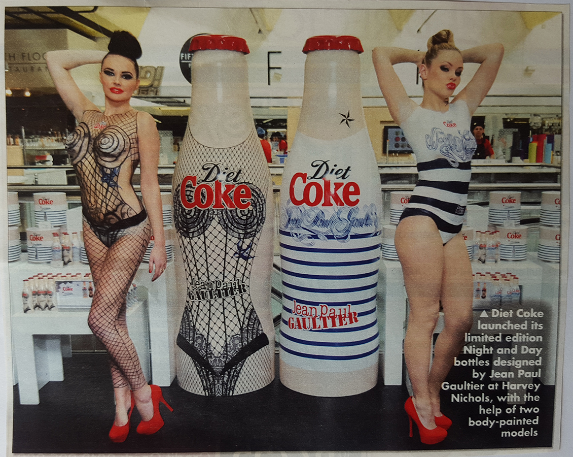 a3 Published September 15, 2015, 2:36 pm in a3 · View full-size image (1130 × 900) Coca Cola Carolyn was commissioned to paint 2 models for the launch of Jean Paul Gaultier’s new ‘Night & Day’ Coca Cola bottles. The models made a surprising early morning appearance in the window of Harvey Nicholls in London Comments are closed.